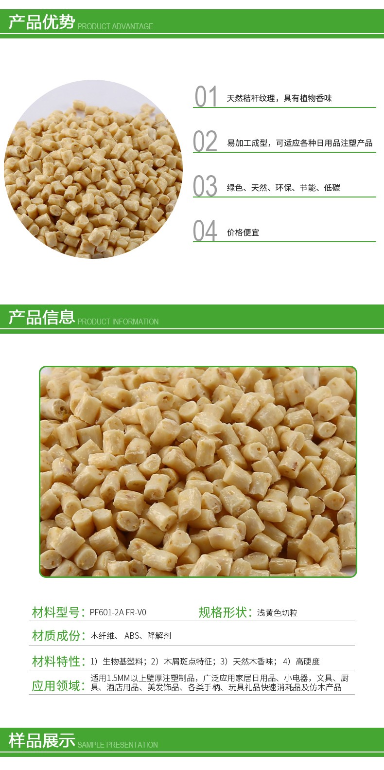 材料特性:1)生物基塑料;2)木屑斑點特征;3)天然木香味;4)高硬度